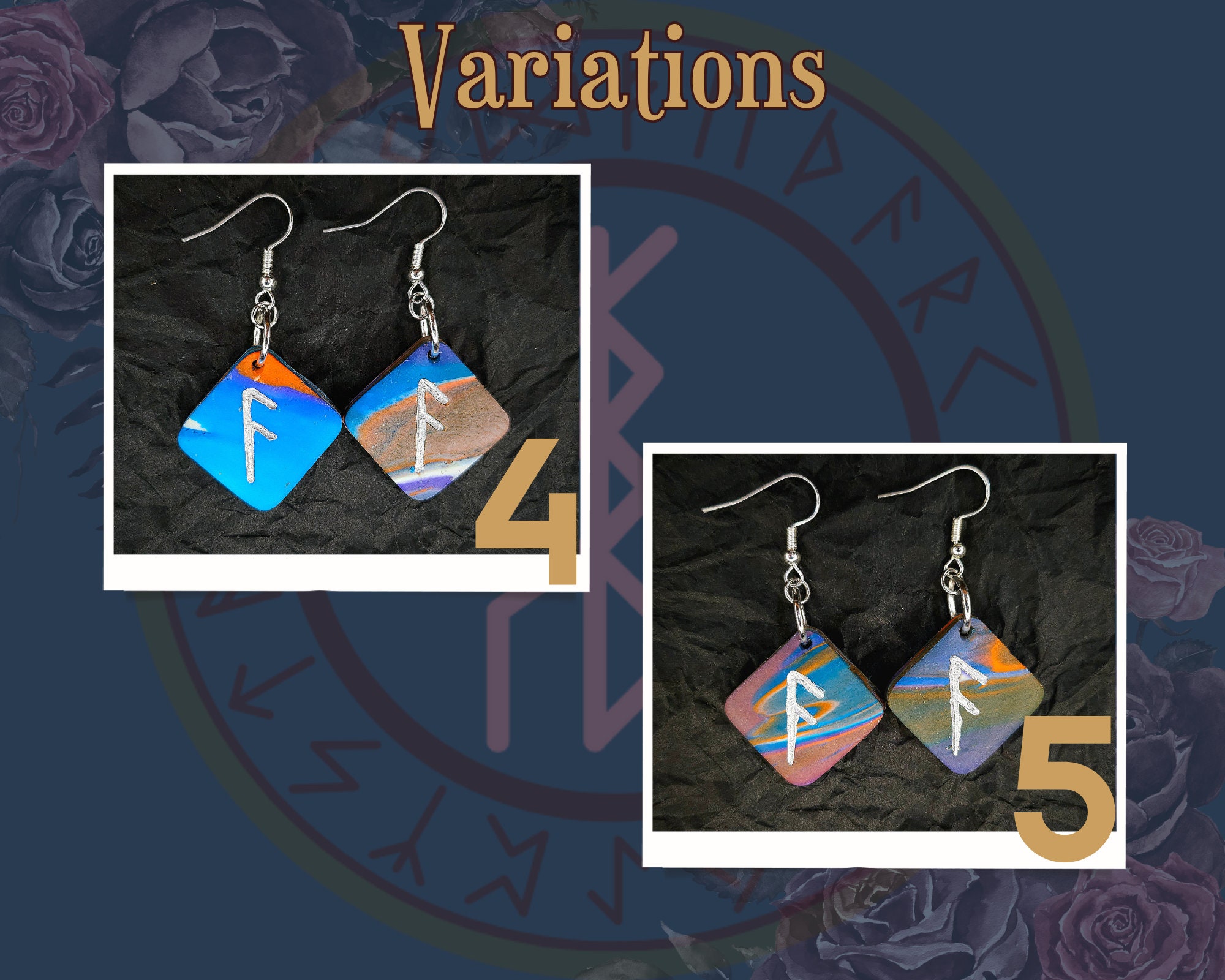Carry the energy of Ansuz with you in this polymer clay earring set. Earrings are approximately 1 inch wide, 1/8 inch thick, and hang 2 inches from the ear. When designing each piece, colors are carefully chosen based on their known meanings and associations. The colors used reflect and enhance the meaning of the rune. Each piece is thoughtfully and carefully made by hand with love and intentions. Each set is finished with a gloss glaze to ensure durability.