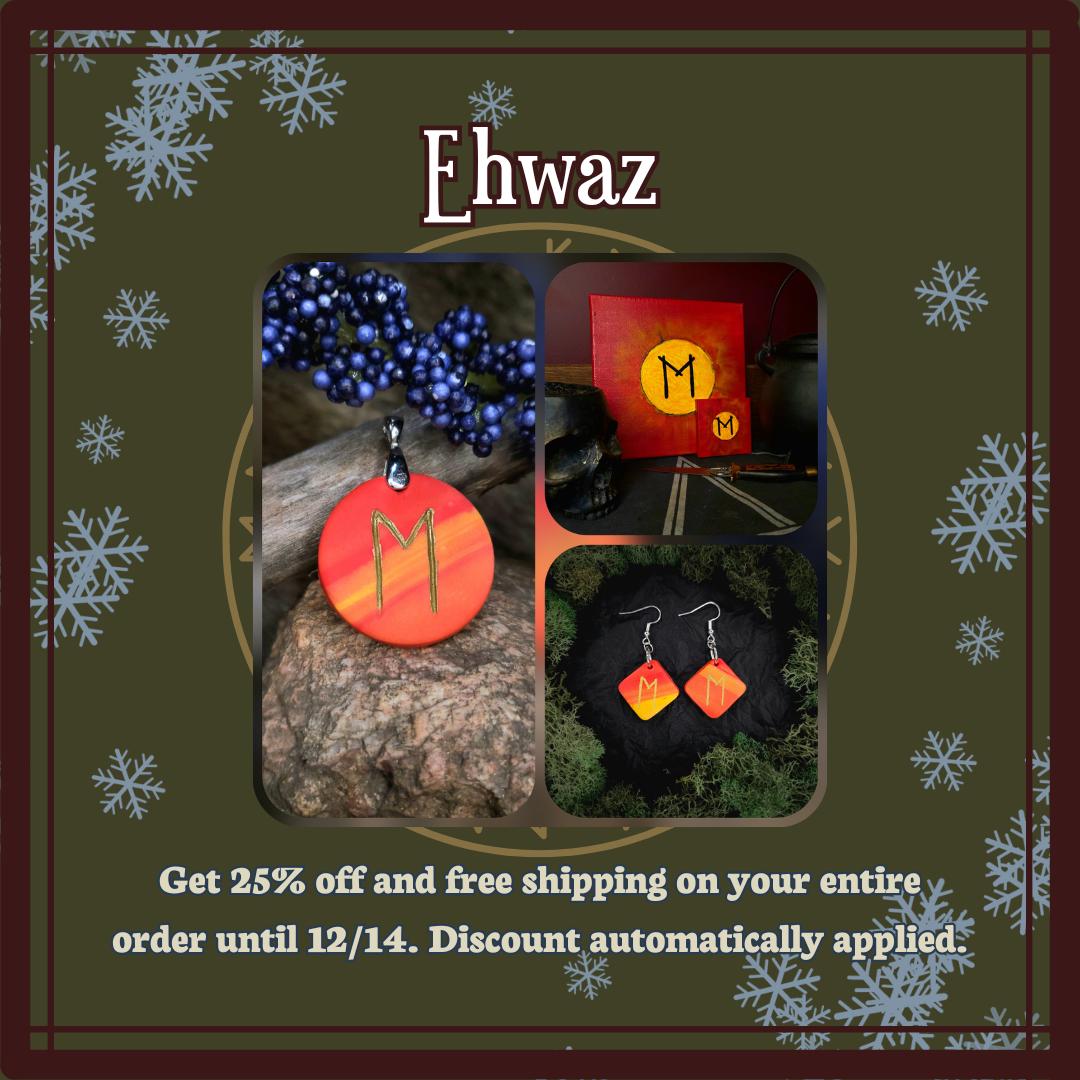 Ehwaz is a rune of partnership and friendship. It translates to “horse” and represents the trust, loyalty, and faithfulness that exists between the horse and rider. It is also a rune of movement, but more so in the metaphorical sense. It ensures movement towards a goal and allows tasks to flow from beginning to end. It also brings a sense of confidence in one’s journey. Ehwaz may be used in several different ways. Perhaps you are looking to establish or strengthen a friendship or partnership. Ehwaz may be gifted to this individual to signify and foster this positive intention. For more personal use, Ehwaz can be helpful to call upon when working to complete a project or task. Carry it with you to amplify these efforts.