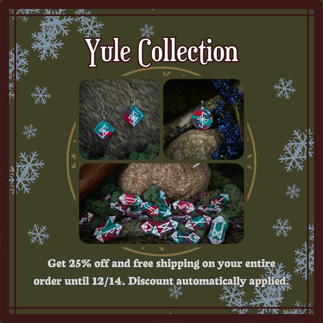 This Bindrune that I created combines 4 runes to honor the energies of Yule. Yule, also known as the Winter Solstice, marks the darkest point of the year. It is the “shortest” day of the year, where we experience the least amount of daylight in the 24 hour period. It’s a time to honor the darkness while also celebrating the return of the light. It’s the time to turn inward, recognize what we need to release, while moving forward into rebirth and renewal.